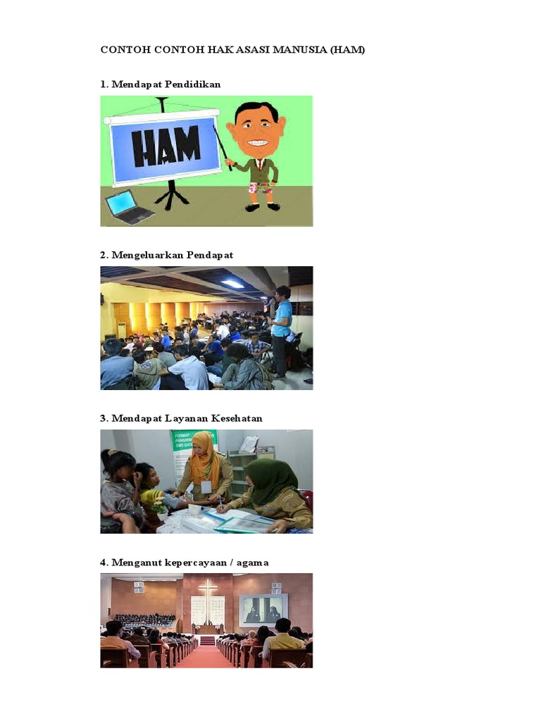 Contoh hak asasi manusia : Hak asasi manusia (ham) yang ada dalam diri manusia masih terbagi ke dalam beberapa hak asasi. Konsep ham pertama kali lahir pada tanggal 10 desember 1948 saat pbb memproklamirkan deklarasi universal ham. Hak keperdataan, hak menuntut kerugian, hak contoh hak manusia. Di antara contoh hak pribadi, yaitu: